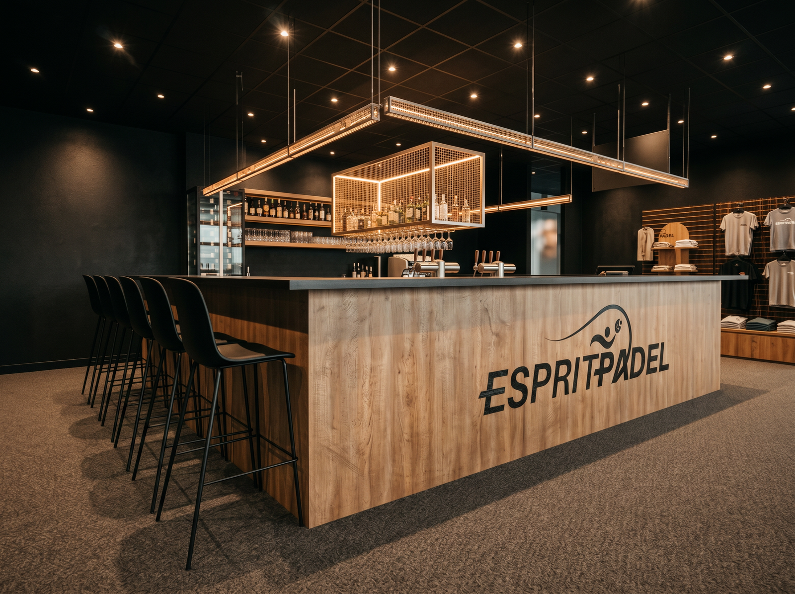 Le snacking premium et la table à thèmes du club Esprit Padel. On joue, on mange bien, on prolonge au bar — entre passionnés.